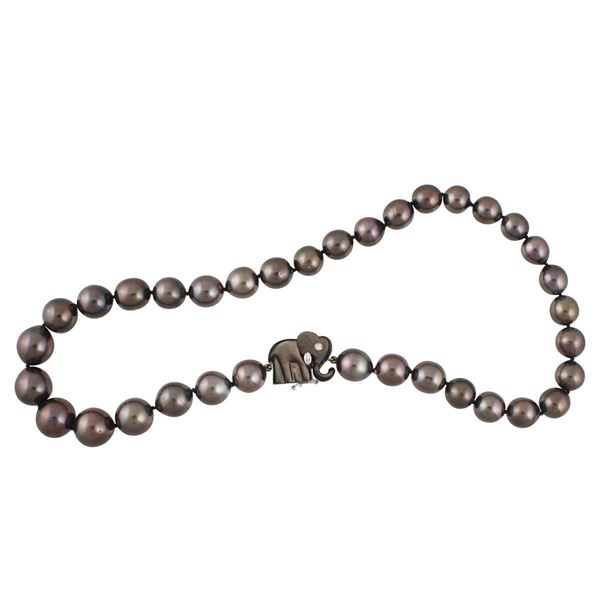 girocollo ad un filo di trentacinque perle coltivate “South Sea” Tahiti poste in gradazione 14,5/10,3 mm. Fermezza laterale in oro bianco e madreperla forgiata a raffigurare un elefantino con occhio costituito da un brillante.