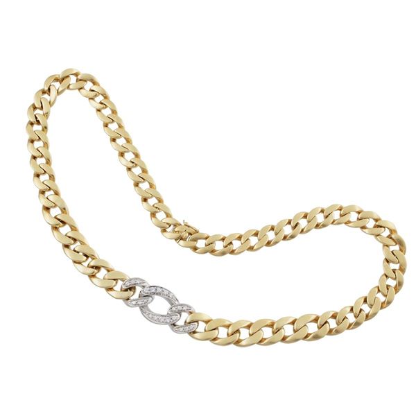 girocollo in oro giallo a catena con tre maglie centrali più grandi in oro bianco e brillanti, gr. 58,3.