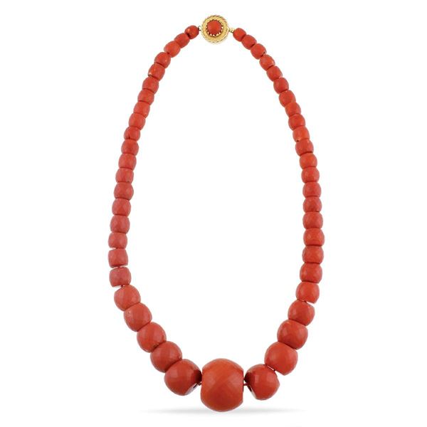 ad un filo di barilotti sfaccettati digradanti in corallo rosso 28,5/8 mm con chiusura tonda in oro giallo centrata da un corallo, gr. 183.