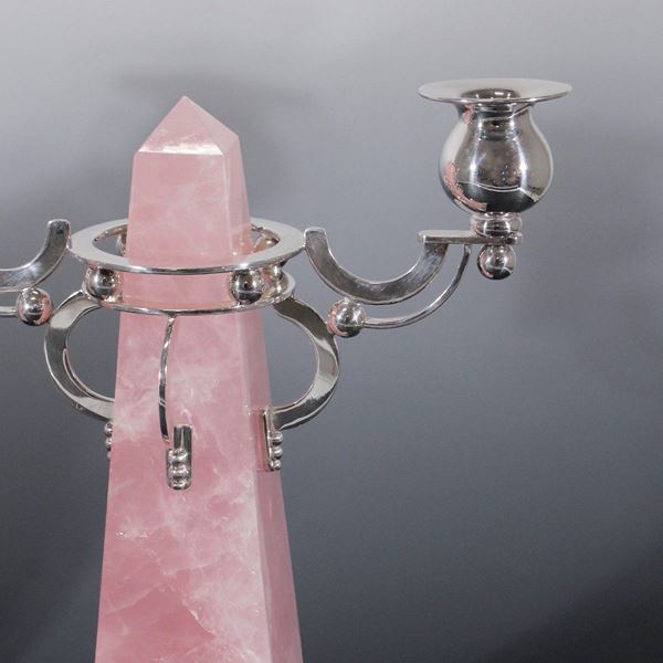 Obelisco in quarzo rosa su base quadrata con bordi arrotondati sostenuta da quattro piedini a sfera schiacciata. Due bracci in argento costituiti da semicerchi, trattengono i peducci sferici portacandele, riportati sull’apice dell’obelisco, altezza 32,5 cm.