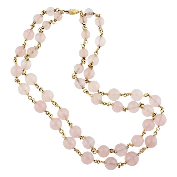 costituito da una collana a due fili di sfere in quarzo rosa concatenate da maglie in oro giallo e chiusura in oro giallo e da un anello a fascia in oro giallo interamente traforata a motivi vegetali e “rocailles” con quarzo ovale cabochon alla sommità.