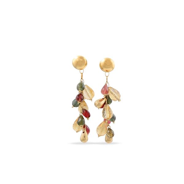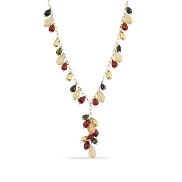 costituita da collana girocollo, orecchini pendenti e anello in oro giallo con quarzi, ametiste, granati, peridot, onici e tormaline a goccia briolettes disposte a grappolo con gocce in oro giallo liscio.