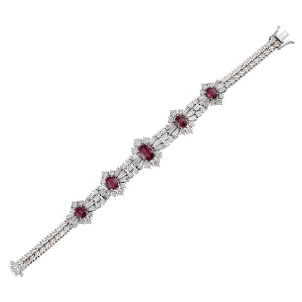 di bracciale e anello in oro bianco: il bracciale con cinque rubini ovali allineati posti in gradazione contornati da brillanti e diamanti taper che si alternano a gruppi di cinque brillanti, con parte terminale lavorata a “spina di pesce”; l’anello che riprende il medesimo motivo con rubino e diamanti. Rubini del peso complessivo di 5,10 ct ca. Diamanti del peso complessivo di 5,50 ct ca., gr. 29,3.