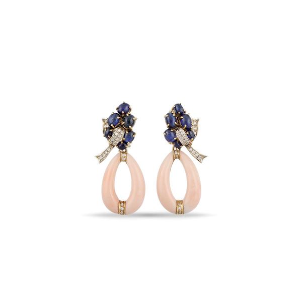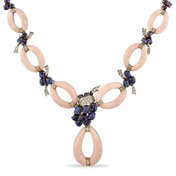 di collana girocollo e orecchini in oro giallo: la collana con parte anteriore ad ovali aperti in corallo rosa, di cui uno più grande sospeso al centro, che si alternano a motivi d’ispirazione vegetale in zaffiri cabochon e brillanti; gli orecchini che riprendono il medesimo motivo con corallo sospeso, gr. 98,8.