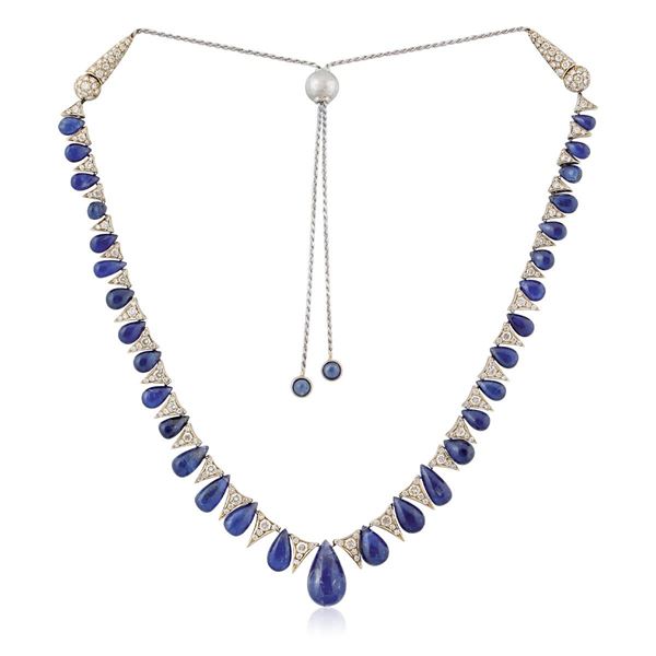 girocollo in oro bianco ad una fila di zaffiri a goccia posti in gradazione che si alternano a triangoli in brillanti riproposti anche nella parte terminale. Parte posteriore a catenella con due zaffiri cabochon ai terminali munita di sfera scorrevole che ne determina la lunghezza.