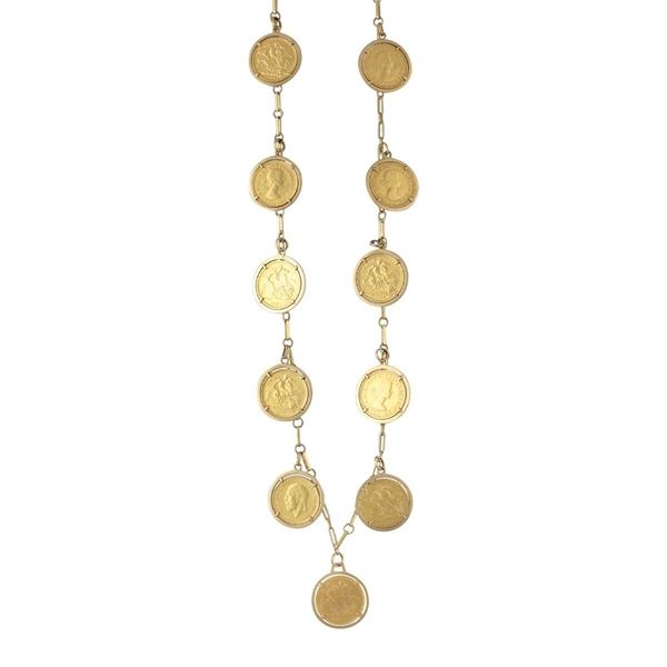 a catena in oro giallo con undici monete in oro sospese, gr. 141,7.