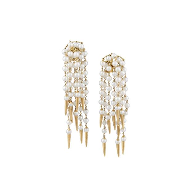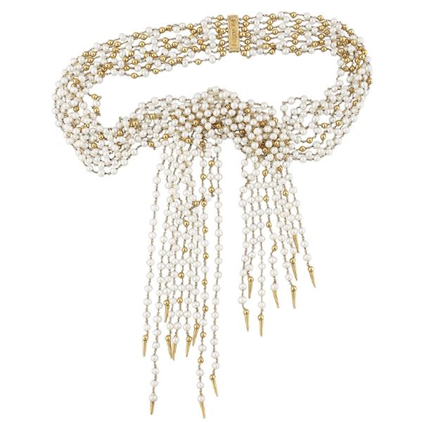 di collana a sciarpa e orecchini pendenti in perle coltivate concatenate da maglie in oro giallo con fermezze e terminali a forma di cono in oro giallo. La collana ulteriormente ornata da sferette.