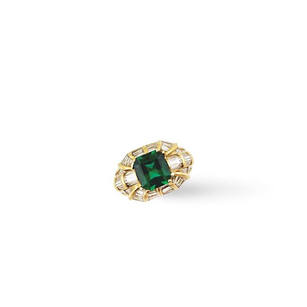 in oro giallo a cupola di diamanti baguettes con smeraldo rettangolare ad angoli smussati alla sommità. Smeraldo del peso di 2,70 ct ca. Diamanti del peso complessivo di 3,50 ct ca., gr. 13.