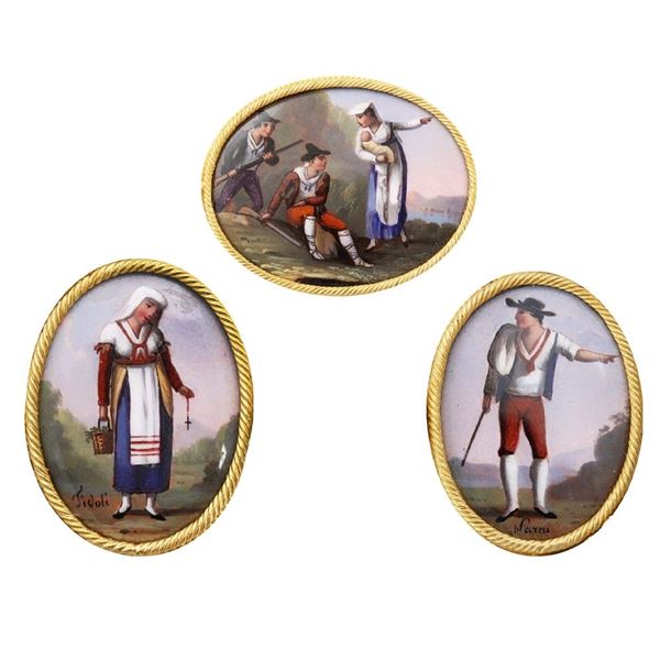 in oro satinato a fascia traforata di ovali cordonati alternati a palmette e piccoli fiori in smalto (mancanze). Parte superiore a ricca cupola di foglie in oro a tre colori alternato, boccioli smaltati e motivi vegetali perlinati che racchiude tre miniature in ceramica raffiguranti ritratti di popolani in abiti tradizionali del Lazio e dell’Umbria, gr. 43,9.