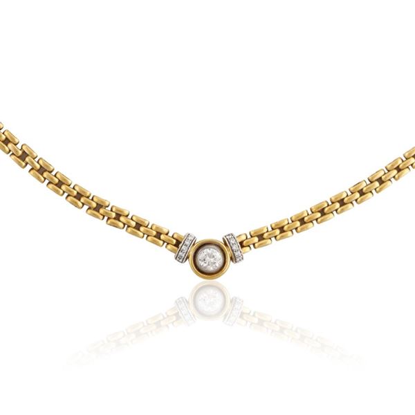 girocollo in oro giallo a maglia morbida con brillante centrale del peso di 1,05 ct ca. affiancato da piccoli brillanti in linea entro riporto in oro bianco, gr. 49,3.