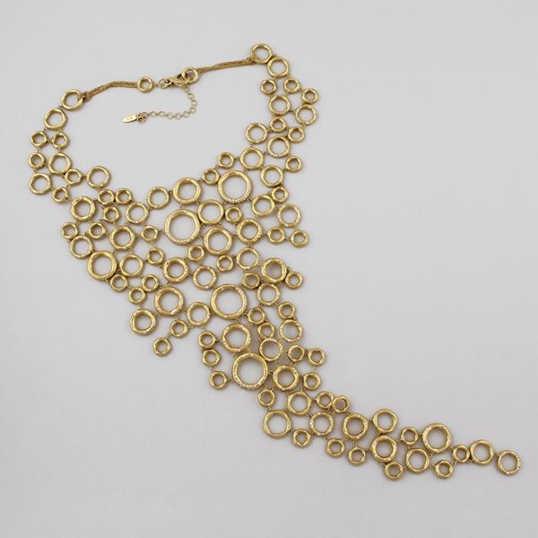 a pettorina in oro giallo interamente formata da anelli di svariate misure disposti asimmetricamente in prevalenza punteggiati da brillanti incastonati. Parte posteriore a catenelle con chiusura a moschettone, gr. 178,7.