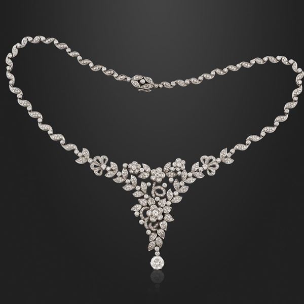 girocollo a volute susseguenti in oro bianco e brillanti con parte centrale a tralci di fiori fogliati in brillanti disposti a disegno triangolare culminante in un brillante sospeso del peso di 1,60 ct ca. Un brillantino mancante gr. 46,8.