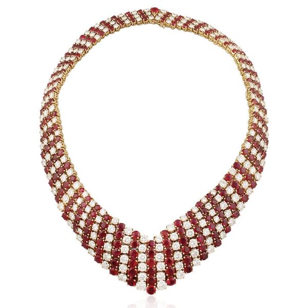 girocollo a morbido nastro digradante interamente realizzata in oro gallo, brillanti e rubini alternati. Brillanti del peso complessivo di 35 ct ca. Rubini del peso complessivo di 47 ct ca., gr. 161,8.