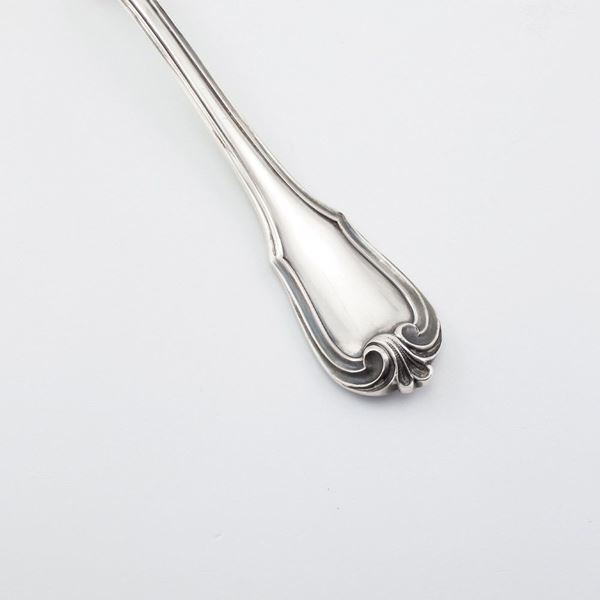 in argento composto da 140 pezzi. Lame dei coltelli da carne e da frutta in metallo. Manici sagomati cesellati a rocailles fogliate, gr. 8700 ca. (esclusi i coltelli da carne e da frutta).
