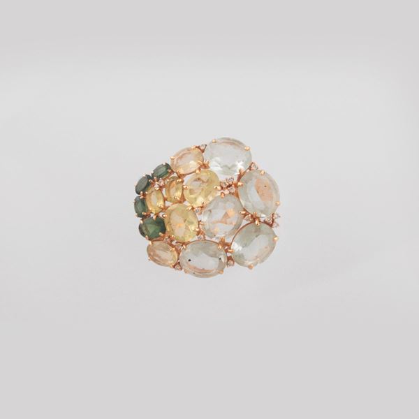 in oro giallo con peridoto e quarzi ovali disposti a formare un motivo circolare impreziosito da piccoli brillanti, gr. 14 ca.