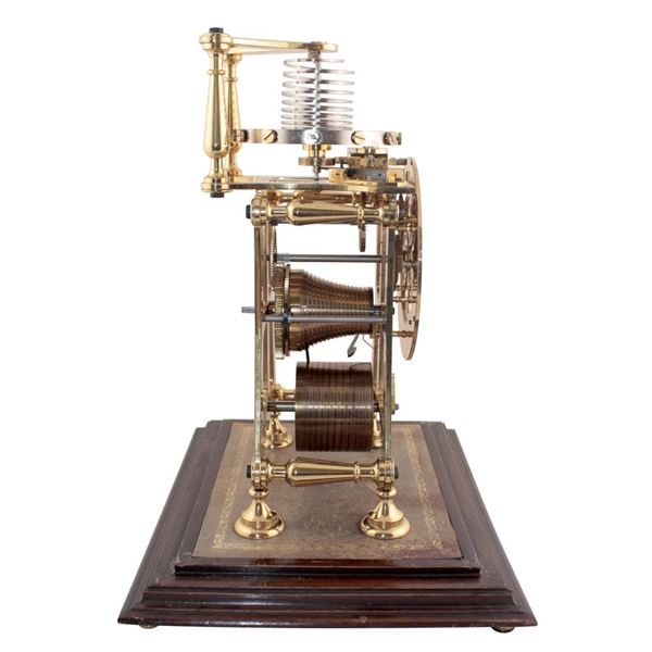 Raro orologio da tavolo in ottone dorato, base in legno e teca in vetro, con scappamento “detent”, (ad arresto) calendario e segni zodiacali