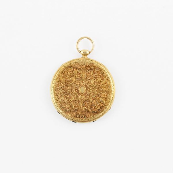 Orologio da tasca, ultra piatto, in oro giallo 18K, cassa con decorazioni floreali. Quadrante danneggiato.