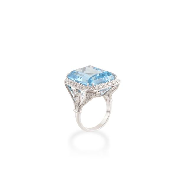 in oro bianco con acquamarina rettangolare ad angoli smussati del peso di 28,00 ct ca. contornata da brillanti che vengono ripresi anche sul gambo. Brillanti del peso complessivo di 1,97 ct., gr. 16,9.
