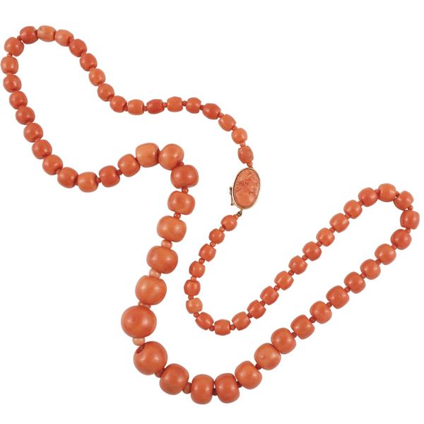 in corallo a scalare 19,2/8,3 mm, chiusura in oro giallo con cammeo, gr. 174,7.