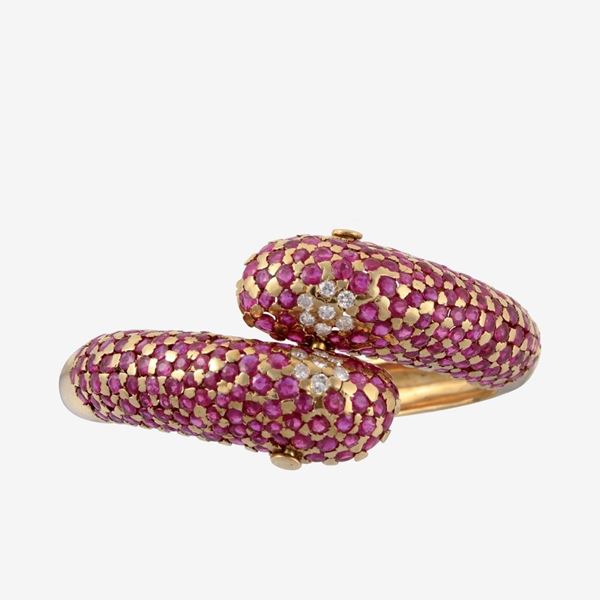 rigido contrariè in oro giallo con parte terminale bombata, pavè in rubini e brillanti, gr. 48,5.