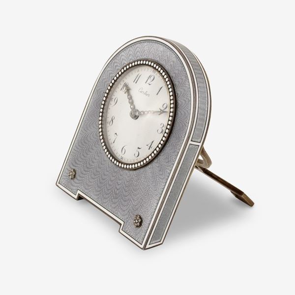 Cassa: No. 4173, cavalletto in argento, smalto grigio guilloché e brillanti con taglio a rosetta