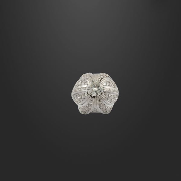 in oro bianco con brillante posto al centro di una cupola in pavé di brillanti e diamanti taper a lato disposti in linea, gr. 22,5. Brillante centrale del peso di 2,60 ct, restanti diamanti del peso complessivo di 4,50 ct ca.