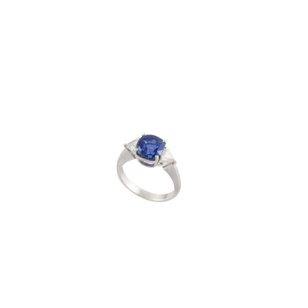in oro bianco con zaffiro taglio cuscino del peso di 4,10 ct affiancato da due diamanti triangolari, gr. 4,9
