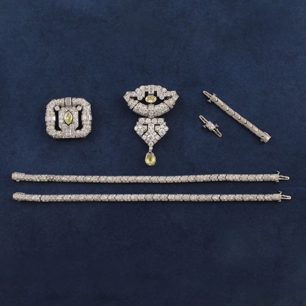 scomponibile in più utilizzi, interamente realizzata in platino e diamanti con al centro un pendente separabile e scomponibile a forma geometrica evidenziato da due diamanti “fancy yellow” uno taglio navette e uno ovale del peso complessivo di 1,04 ct ca. e da un diamante briolette “fancy yellow” pendente del peso di 3 ct ca., gr. 69,1. Diamanti incolore del peso complessivo di 26 ct ca.