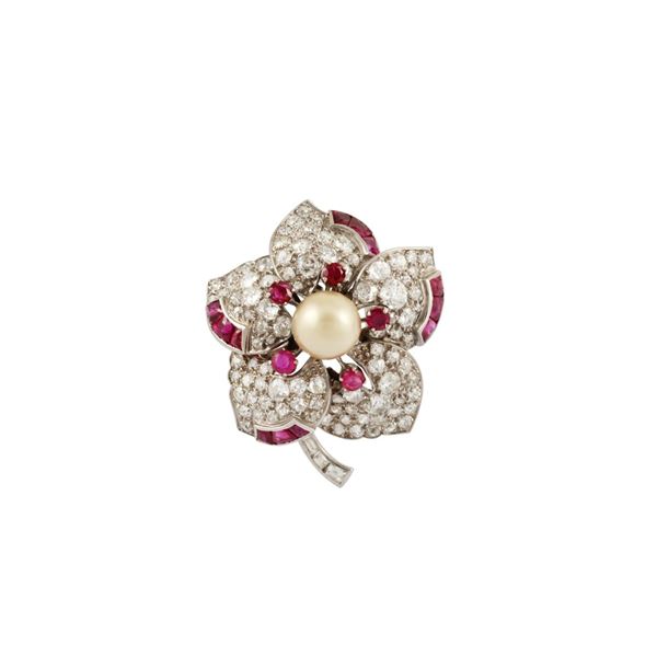 a clip in platino a fiore con petali in pavé di diamanti e rubini ad ornamento, al centro una perla 9,5 mm, gr. 20,6.
