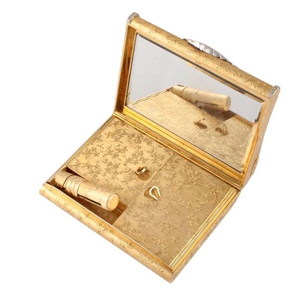 in oro giallo e bianco finemente cesellata a ramage e profilata da brillanti, chiusura a motivo vegetale ornata da brillanti. All'interno scomparti, porta rossetto, piccolo pettine e specchio, gr. lordi 429.