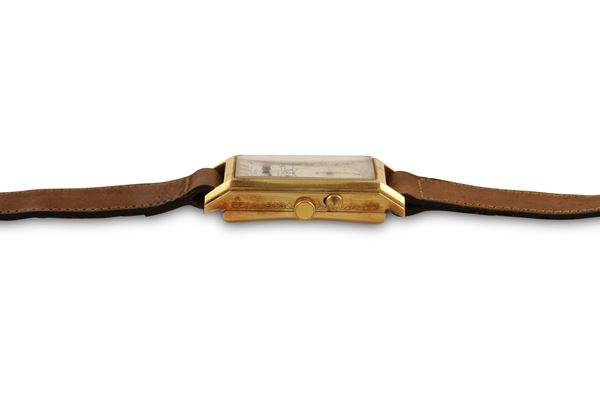 Cassa: in oro giallo 18K, di forma rettangolare, pulsante a slitta per cronografo, fondello a pressione
