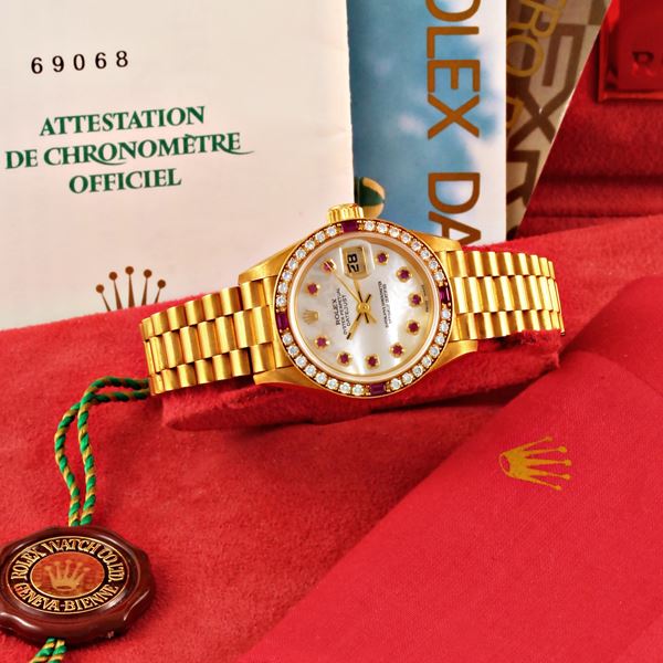 Cassa: oro giallo 18K,  lunetta in brillanti e rubini, fondello a vite. Vetro zaffiro