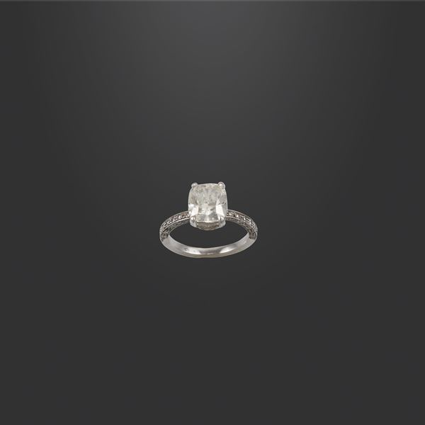 in oro bianco con diamante a cuscino taglio antico europeo del peso di 3,01 ct, impreziosito da piccoli brillanti ripresi anche su parte del gambo, gr. 3,4.