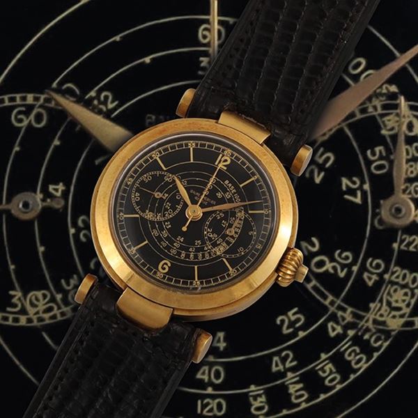 Quadrante: nero "gilt" con numeri Arabi, scala tachimetrica, indici a bastone. Sfere a foglia