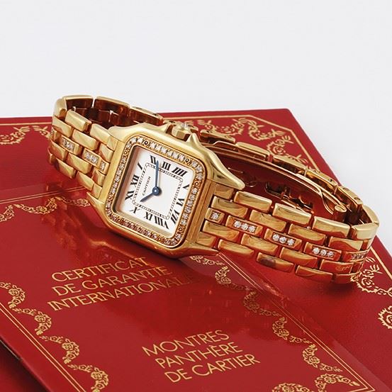 Cassa: in oro giallo 18K, lunetta in brillanti, fondello serrato da viti.