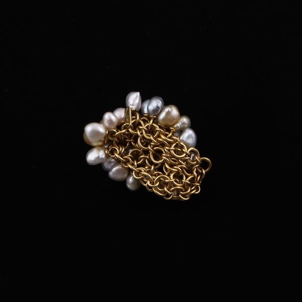 in oro giallo a morbida fascia di maglie tonde, sormontato da un ciuffo di perle d'acqua dolce, gr. 24,6.