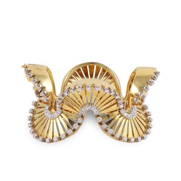 rigido realizzato in oro giallo e bianco a larga fascia ondulata traforata con parte anteriore impreziosita da brillanti del peso complessivo di 2,60 ct ca., gr. 114,8.