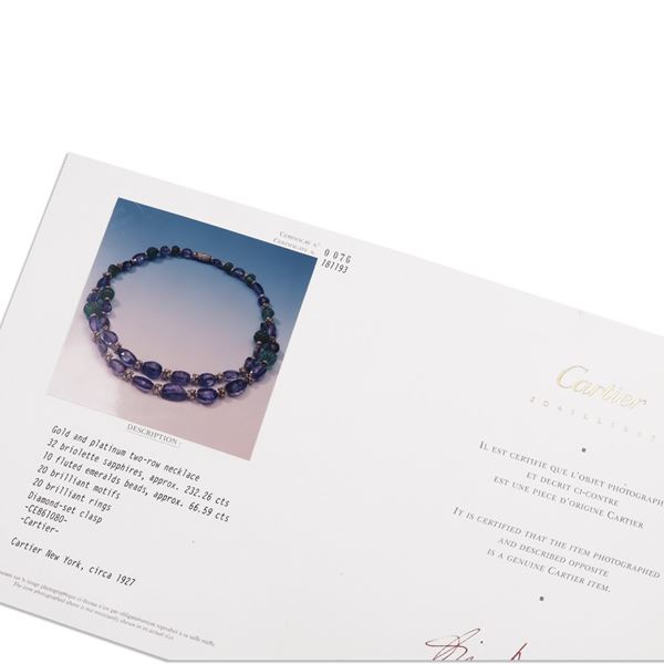 Gr. 111,2. Zaffiri del peso complessivo di 232,26 ct, smeraldi del peso complessivo di 66,59 ct.