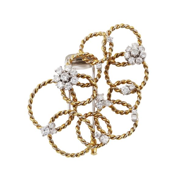 composta da spilla e orecchini a clip, formati da un insieme di cerchi intrecciati in oro giallo lavorato a cordoncino, ornati da brillanti e diamanti taglio navette del peso complessivo di 4,60 ct ca., gr. 47,6.
