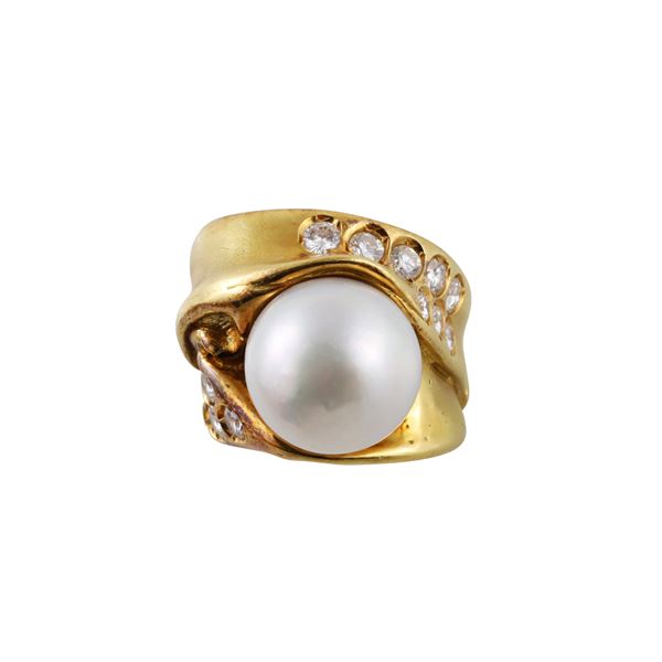 in oro giallo a fascia sagomata impreziosito da brillanti del peso complessivo di 1 ct ca., sormontato da una perla coltivata 13,5 mm, gr. 25,9.