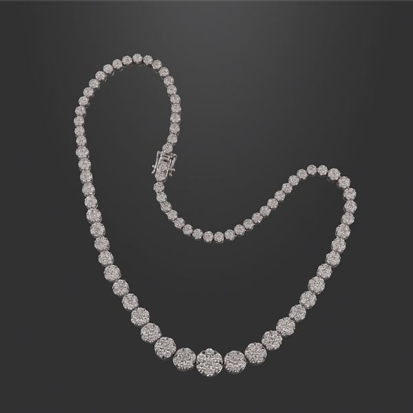 in oro bianco a motivi circolari posti in gradazione, impreziositi da diamanti in pavé del peso complessivo di 13 ct ca., gr. 41.