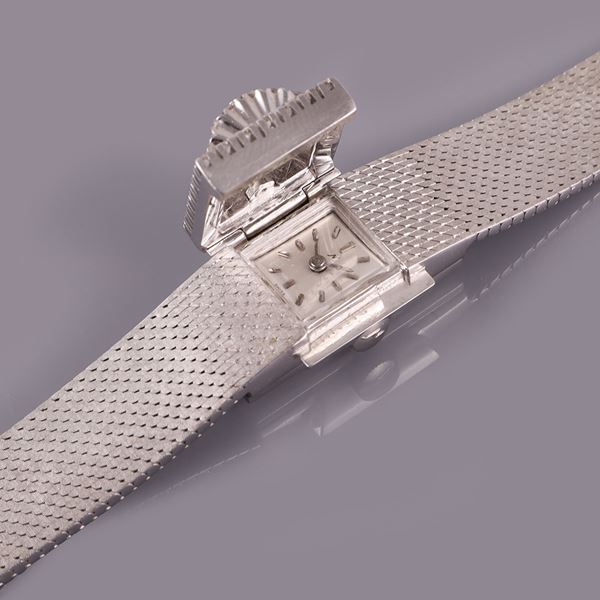 in oro bianco, movimento meccanico a carica manuale, cassa rettangolare con quadrante a scomparsa, ornato da diamanti, gr. lordi 48.