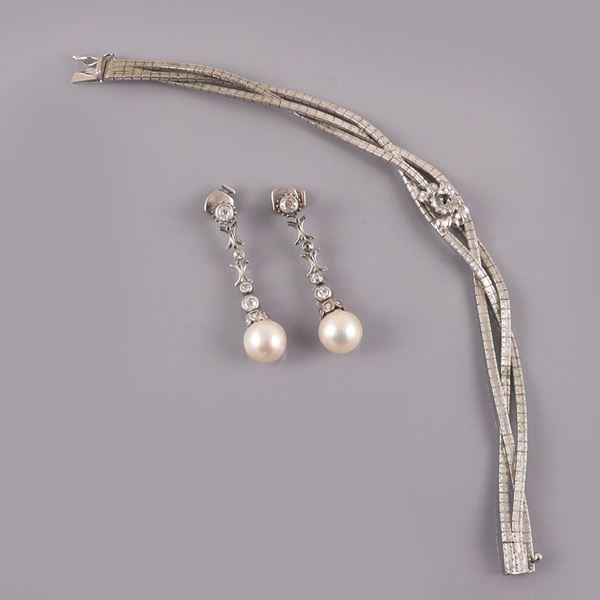 composto da orecchini pendenti in oro bianco con diamanti taglio antico europeo e perle coltivate terminali, gr. 9,9 e bracciale in argento a nastro intrecciato con motivo floreale al centro, gr. 17,8.