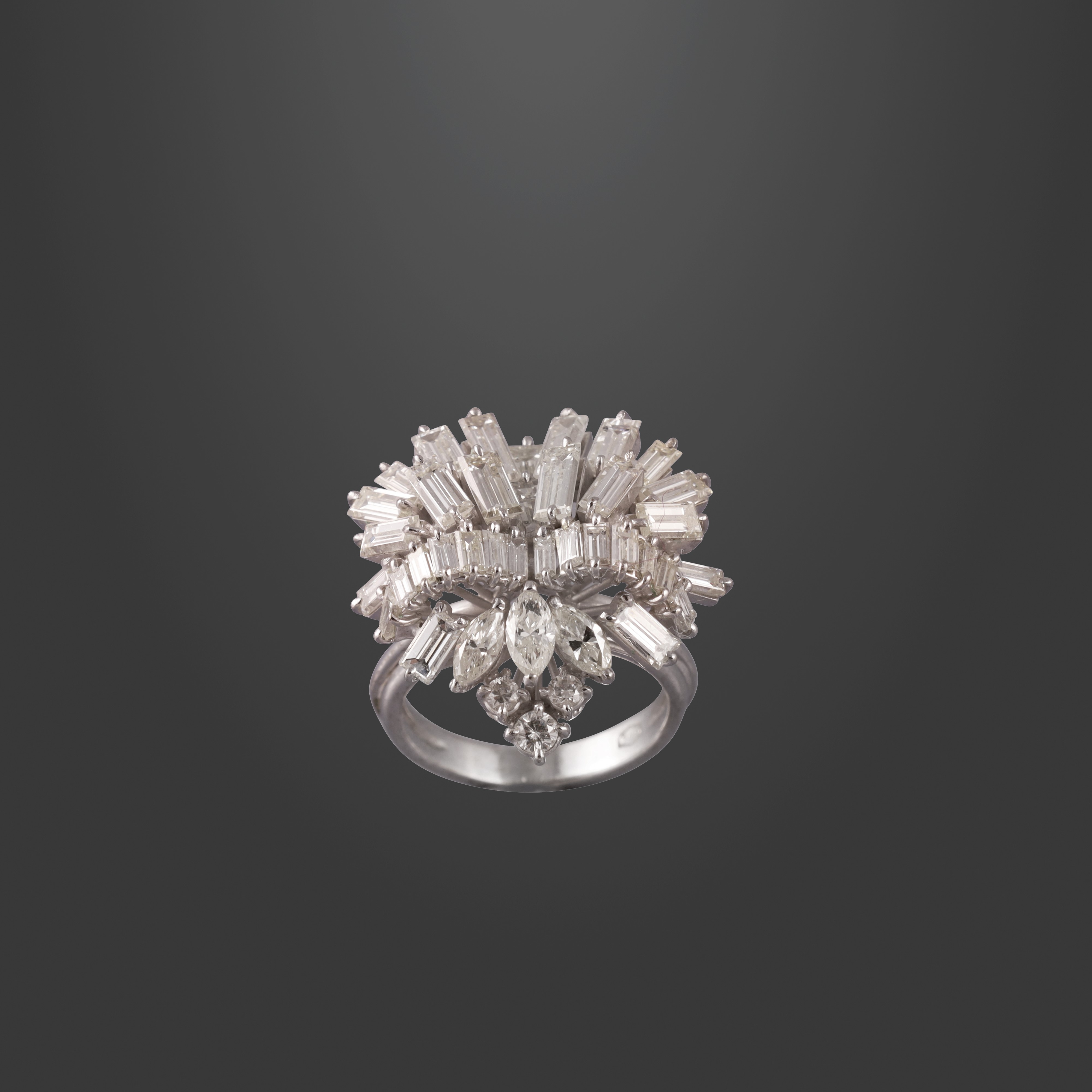 in oro bianco, sormontato da un motivo cuoriforme stilizzato in diamanti dai tagli differenti, del peso complessivo di 3 ct ca., gr. 10,5.