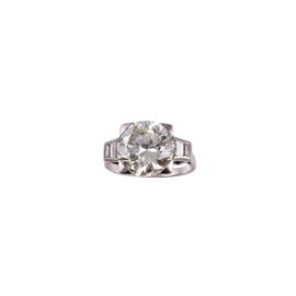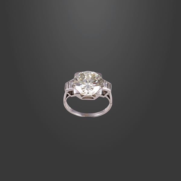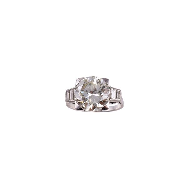 in platino con diamante taglio antico europeo del peso di 5,20 ct ca., affiancato lateralmente da diamanti taglio baguette, gr. 6,6.