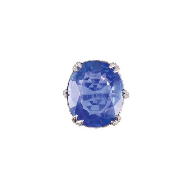 con grande zaffiro ovale del peso di 25,54 ct ca., montatura in platino traforata ornata da diamanti, gr. 12,7.
