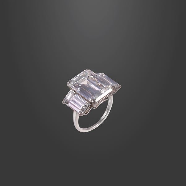 in platino con diamante rettangolare posto al centro, del peso di 9,88 ct, affiancato da due diamanti rettangolari, del peso complessivo di 4,27 ct ca., gr. 8. Corredato da custodia originale.