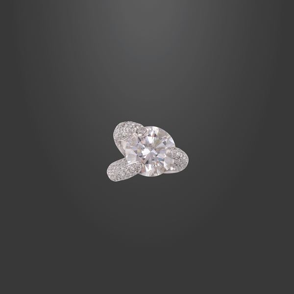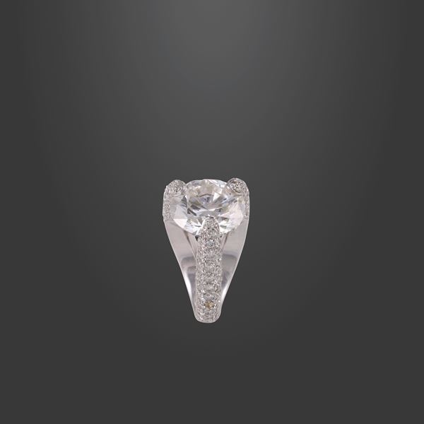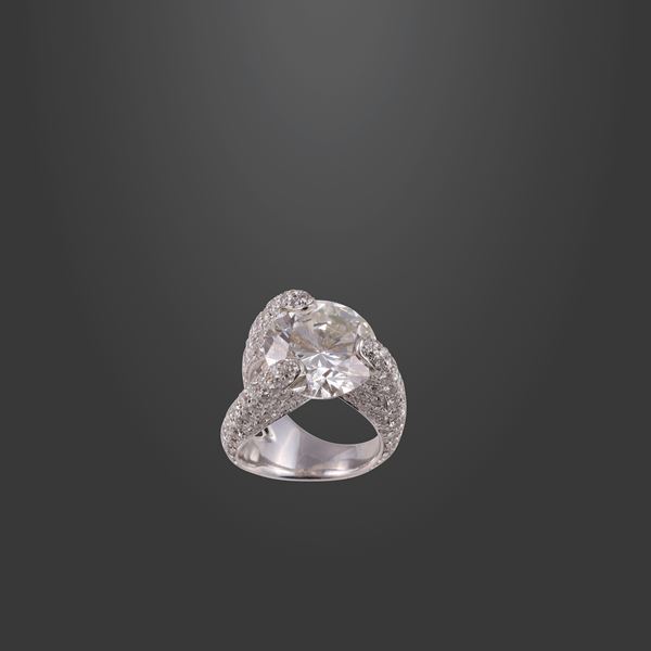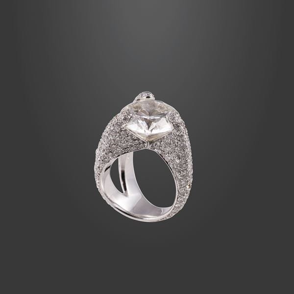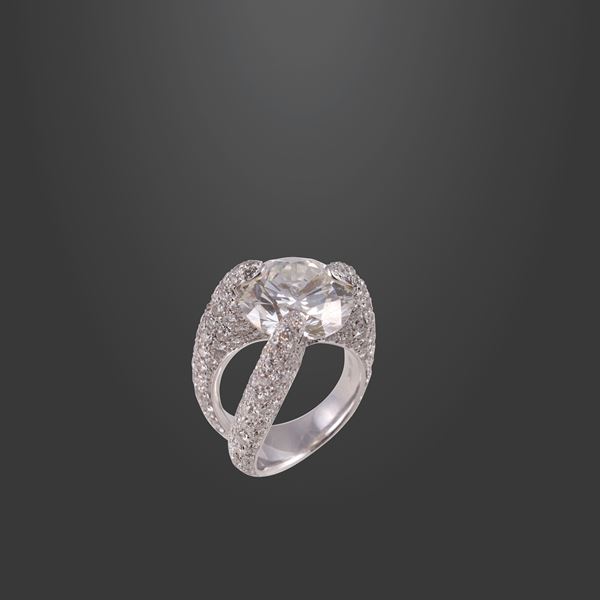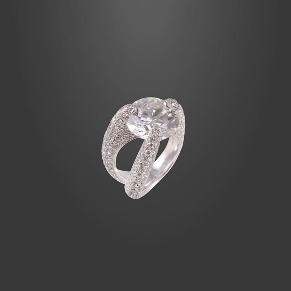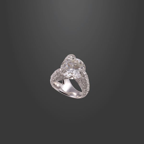 in oro bianco e giallo con al centro uno zaffiro ovale del peso di 10,78 ct, affiancato lateralmente da due diamanti triangolari del peso complessivo di 1,30 ct ca., gr. 7,3.