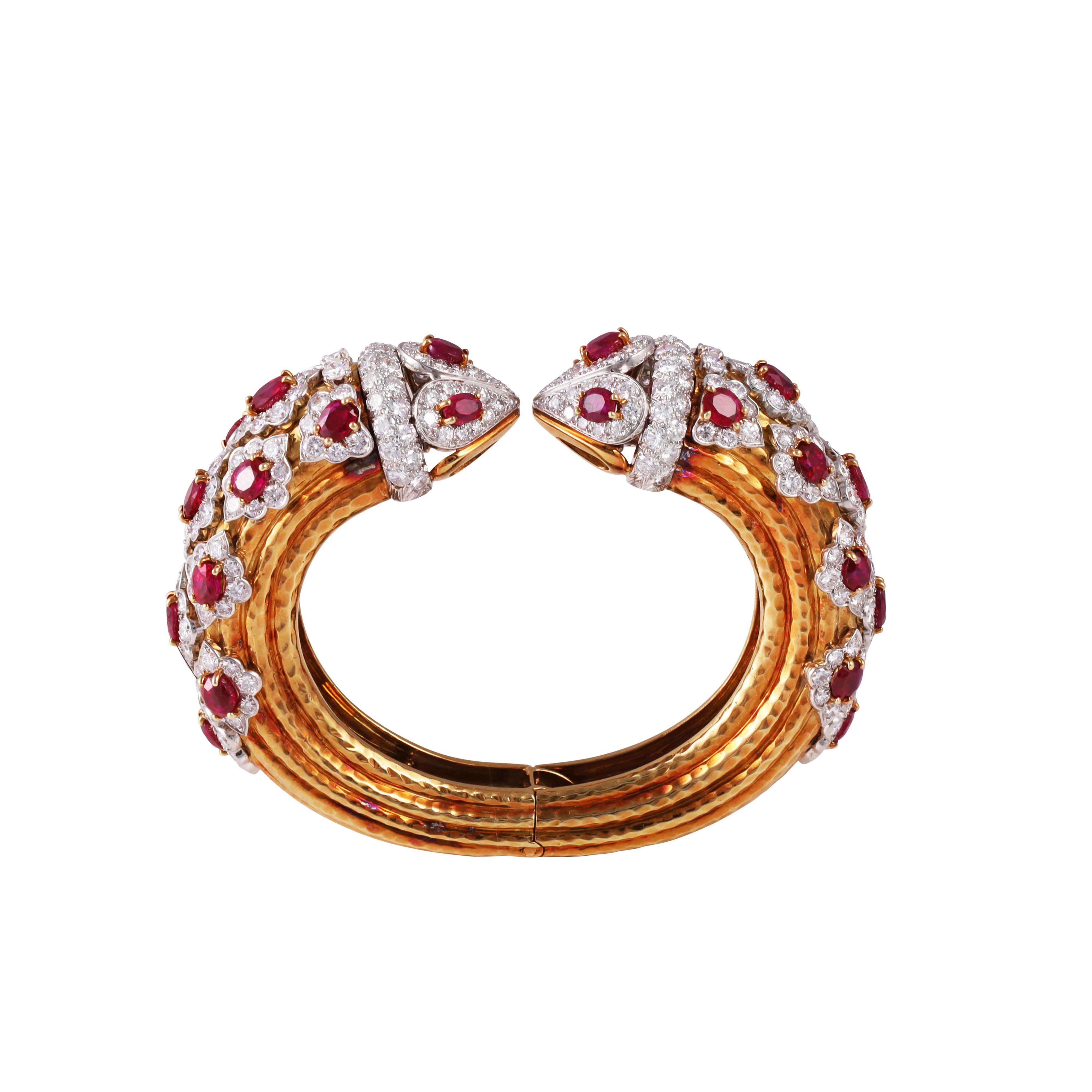 realizzato in oro giallo e bianco, a corpo rigido, bombato e scanalato, ornato da riporti in platino a forma di losanga, impreziositi da rubini ovali e brillanti. Le estremità del bracciale sono evidenziate da due elementi triangolari contrapposti, formati da motivi a goccia in brillanti e rubini, gr. 117,6. Diamanti del peso complessivo di 30 ct ca., rubini del peso complessivo di 18 ct ca. Corredato da custodia originale.