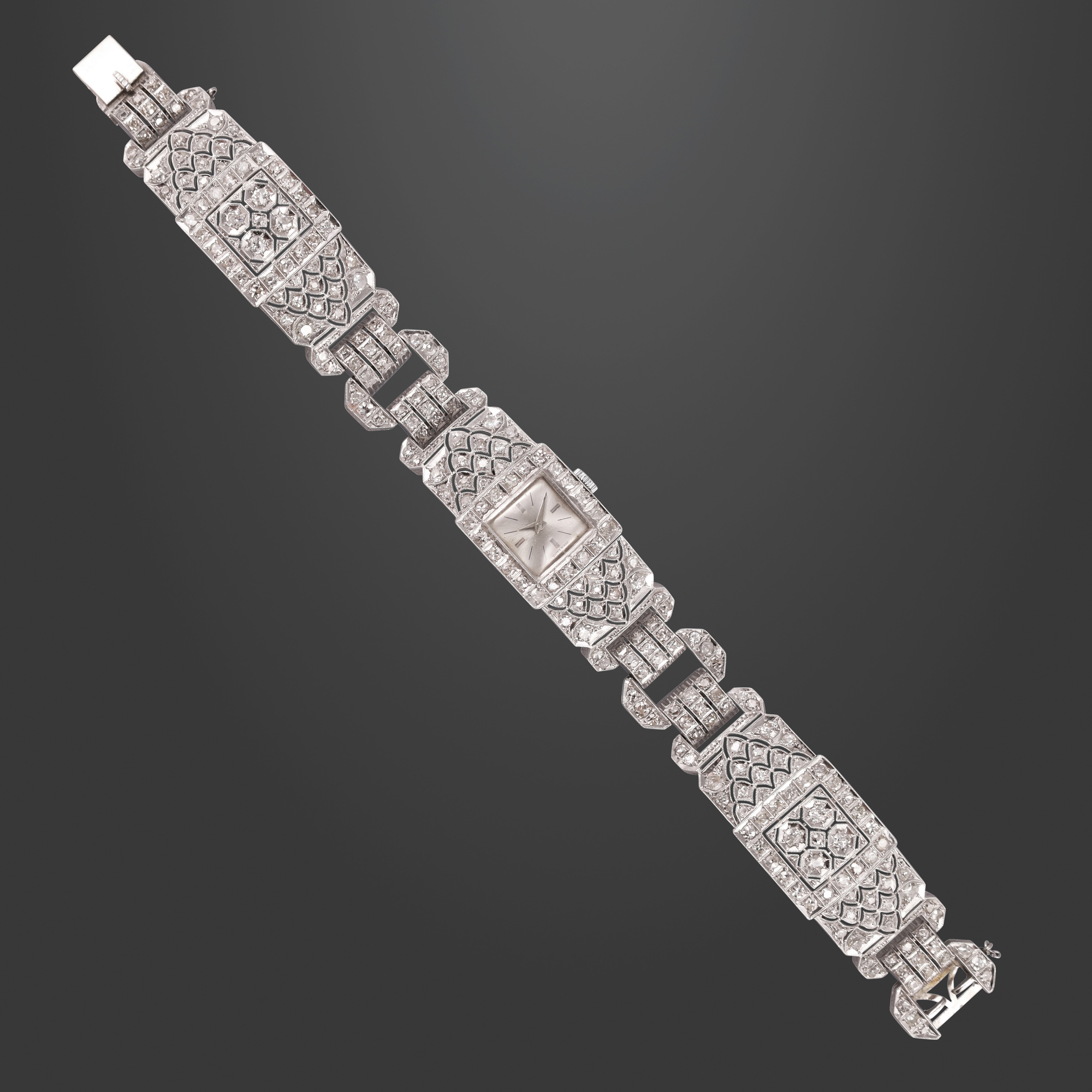 in platino, composto da elementi geometrici traforati interamente impreziosito da diamanti, quadrante argentato con indici, gr. lordi 37,2.